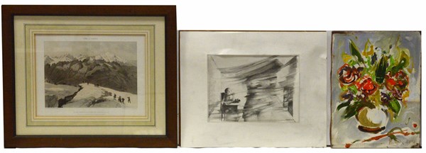 Lotto composto da un' incisione con scorcio del Monte Bianco, un disegno e un dipinto raffigurante vaso di fiori (difetti)