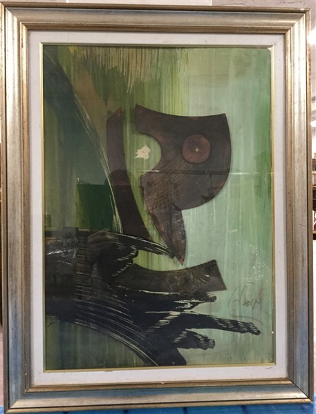 Firma indecifrata, composizione di sagome in legno applicate su pannello di compensato dipinto (cm 70x50) firmata in basso a destra, in cornice