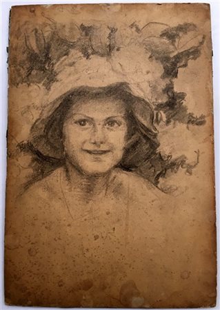 "Ritratto femminile", matita su cartone pressato (cm 45,5x31) iscritto al verso (difetti)