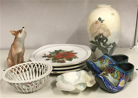 Lotto composto da un vaso, tre piatti, due cestini, una scultura raffigurante volpe e due modelli di zoccolo in ceramica e porcellana di manifatture e decori diversi (difetti e restauri)