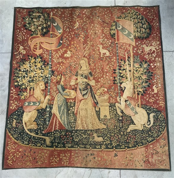 Arazzo meccanico stampato decorato con la scena ''La dama e l'unicorno'', secol