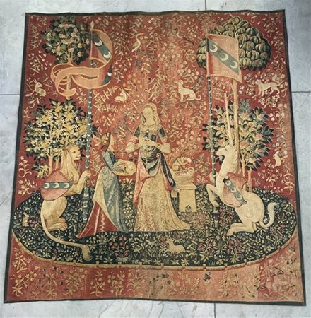 Arazzo meccanico stampato decorato con la scena ''La dama e l'unicorno'', secolo XX, Etichetta al verso: Edition dArt de Rambouillet (cm 218x205) (difetti)