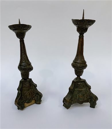 Coppia di candelieri tripodi in rame sbalzato (h cm 35), sec. XVIII (difetti e mancanze)
