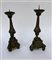 Coppia di candelieri tripodi in rame sbalzato (h cm 35), sec. XVIII (difetti e