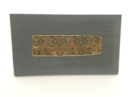 Decoro con tulipani nei toni del beige, nocciola e azzurro su fondo sabbia. Montato su tela intelaiata color aviazione (misura del pannello 55,5x31; il tappeto 35x10) (difetti e rapature)