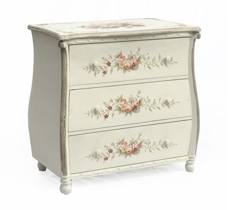 Comoncino di forma mossa a tre cassetti in legno laccato avorio e dipinto in policromia a mazzi di fiori (cm 85x85x49) (difetti)