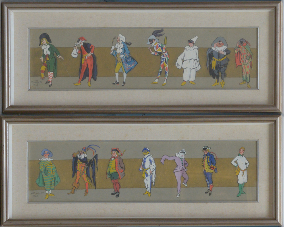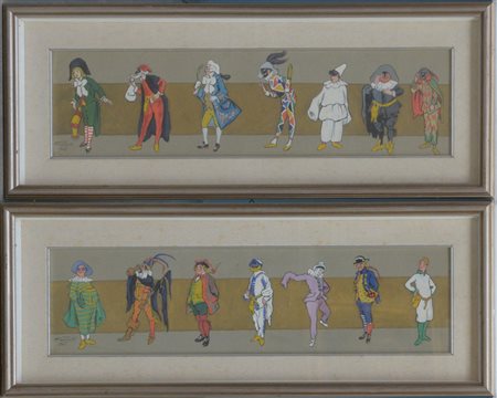 Romeo Marchetti "Figure in maschera" 1947 coppia di tecniche miste su cartoncino
