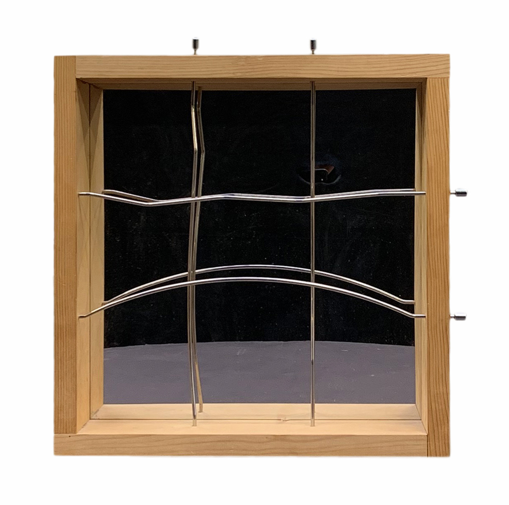 multiplo-scultura in legno, fili di acciaio inox e specchio in metacrilato