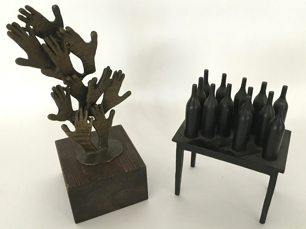 Lotto composto da due sculture moderne: un multiplo in bronzo di Mario Avati "Tavolo con bottiglie" del 1978 per Olivetti, ed. 14/100 e una piccola scultura in bronzo su base lignea raffigurante mani di autore indecifrato