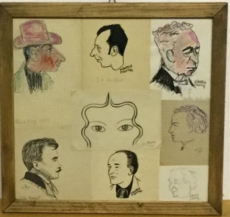 Lotto composto da otto piccoli ritratti montati in un unica cornice raffiguranti personaggi tra cui Robert Picq, Artur Rubenstein e Jules Bonnot