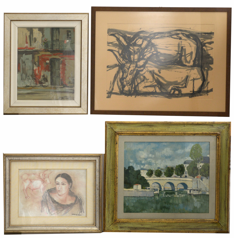 Lotto composto da un dipinto olio su tela di Max Dissar raffigurante uno scorcio di Parigi, due opere di Romano Battaglia di tecniche e soggetti diversi e un dipinto di Paolo Porri, olio su tela, raffigurante case