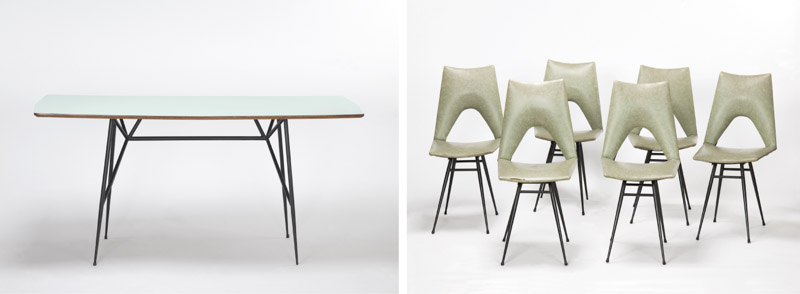 Italienische Manufaktur/Manifattura italiana (Mailand/Milano 1920 – 2006) Set tavolo / 6 sedie, anni ‘70;Struttura in ferro, legno con base in formica, sedie rivestite con tessuto