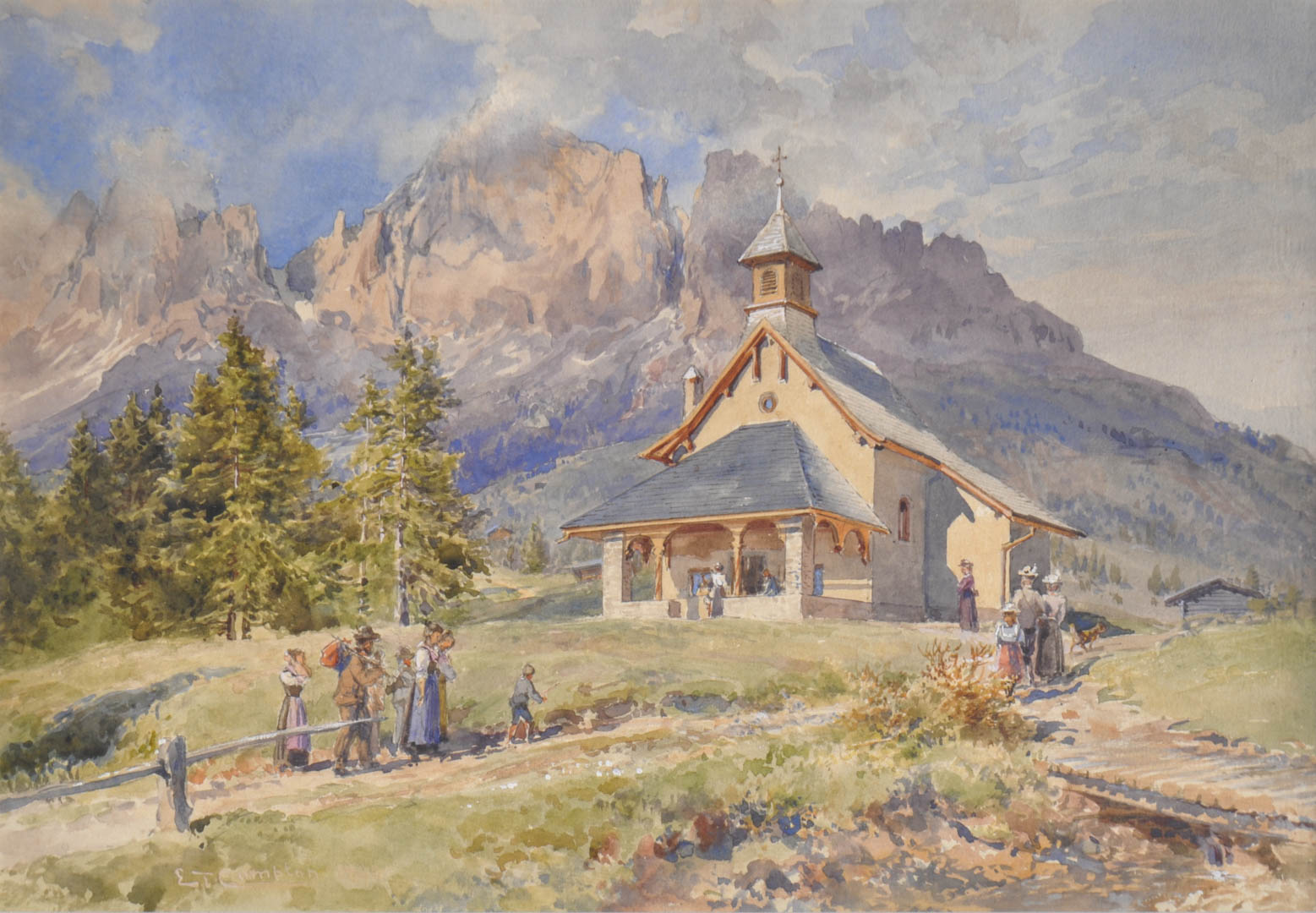 Edward Theodore Compton (London 1849 – Feldafing am Starnberger See 1921) Chiesetta di San Giuseppe sul Passo di Carezza;Acquerello, 27,5 x 39 cm, in cornice
