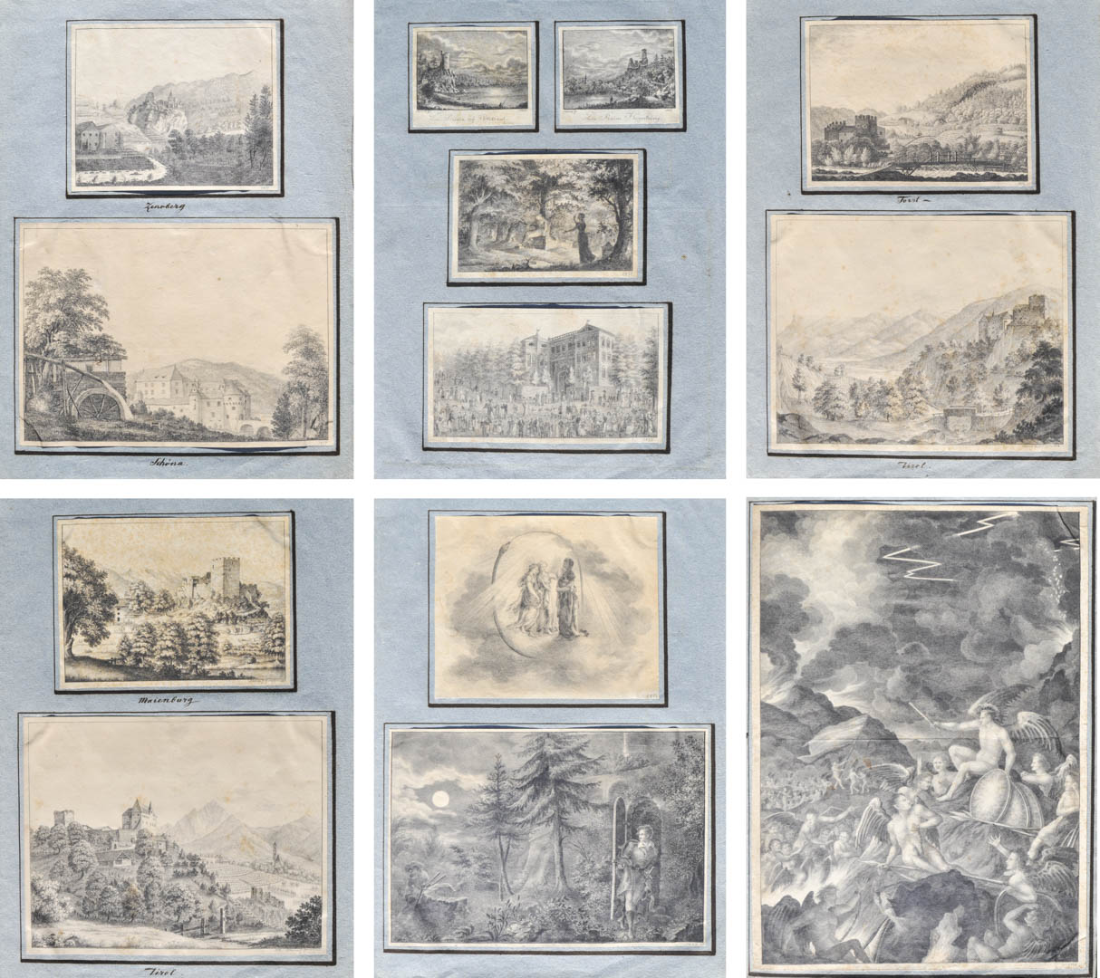 Johanna von Isser-Großrubatscher (Neustift/Novacella 1802 – Innsbruck 1880) Albo „Zeichnungen von Johanna G.r“, 1817 segg.;61 Bleistiftzeichnungen u. 6 Aquarelle, verschiedene Formate, Albumgröße 39,2