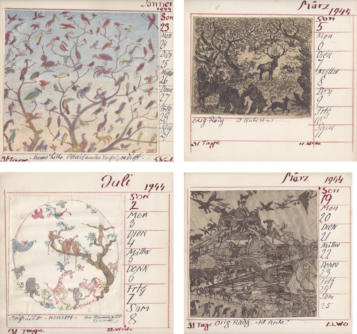 Oskar Laske (Czernowitz 1874 – Wien/Vienna 1951) Calendario 1944 – Dr. Anna Spitzmüller;54 fogli, ca. 22,5 x 23 cm ciascuno, disegni e scritte autografe con raffigurazione