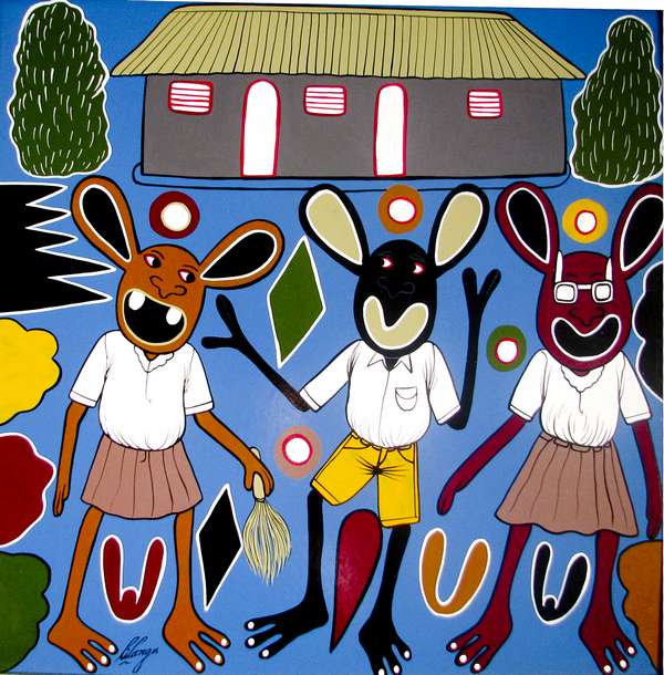 George Lilanga Watoto wa shule olio su masonite, cm. 61x61 Firma in basso a...
