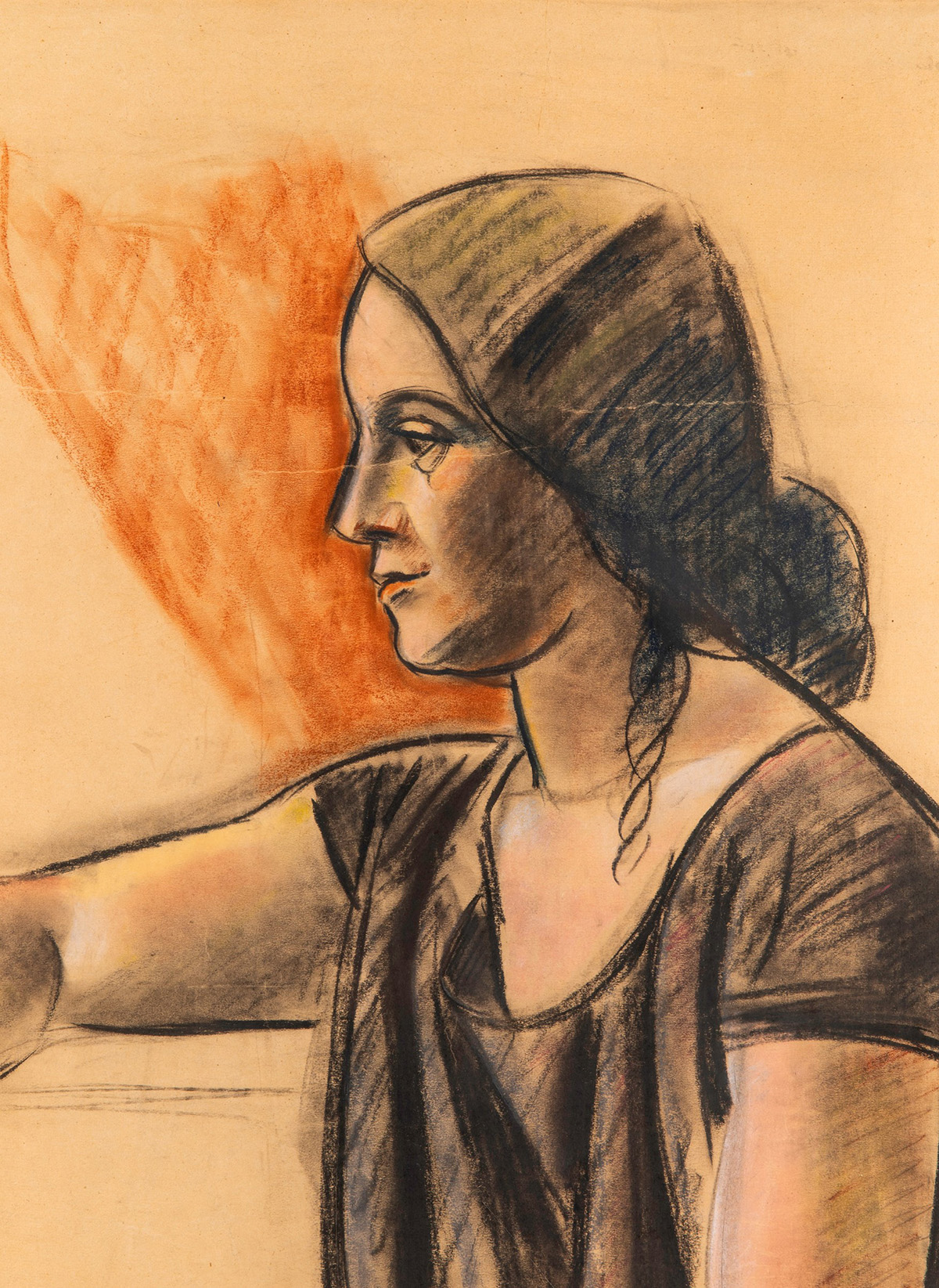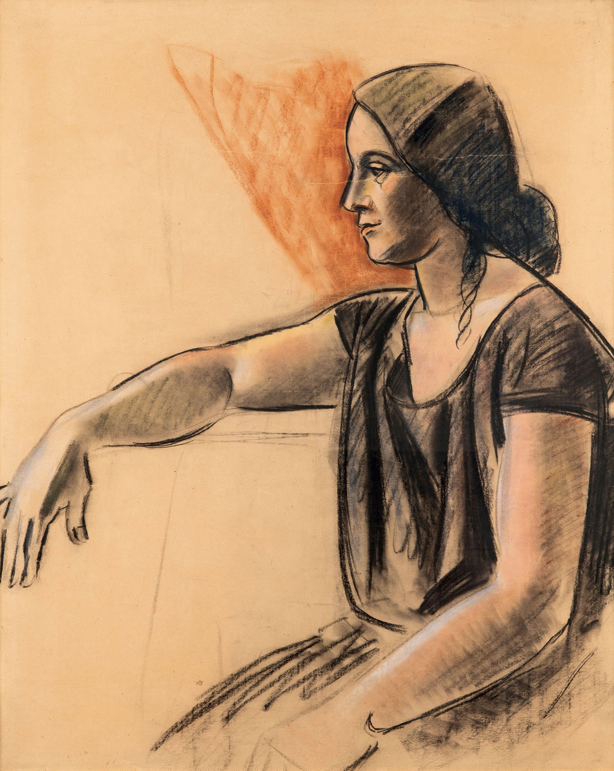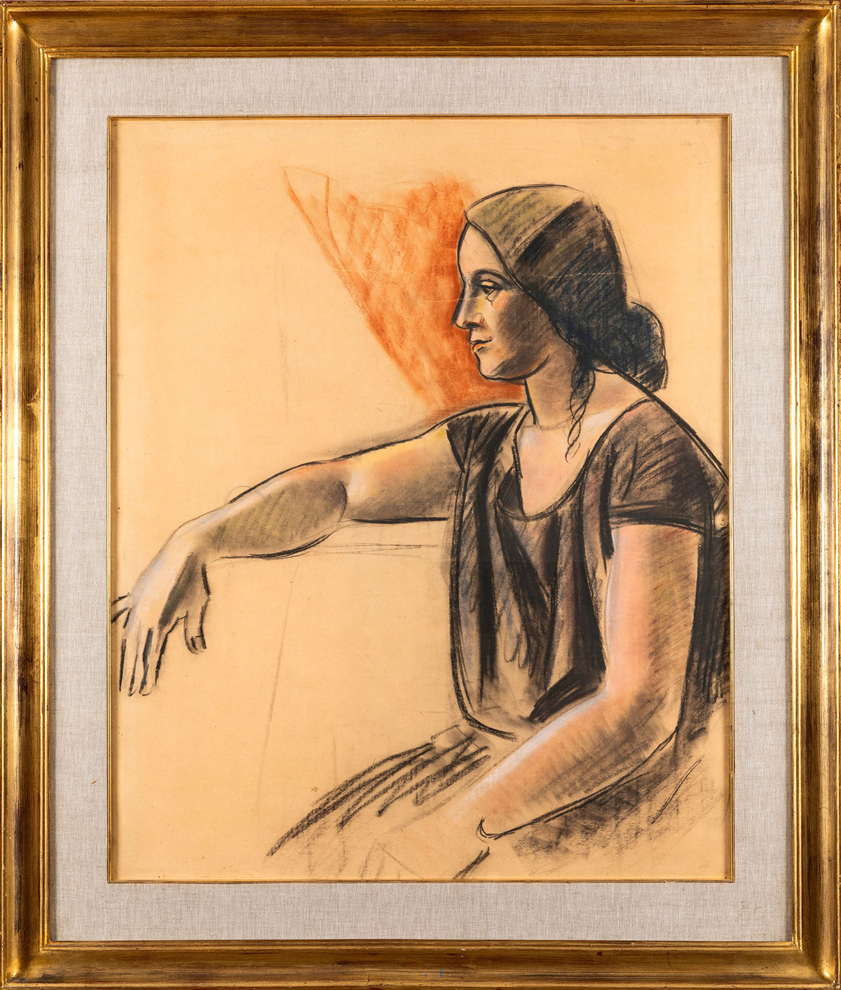 Achille Funi (1890-1972), Figura seduta, 1940 ca, tecnica mista su carta riportata su tela, cm 85,5x69 , Provenienza: Galleria Gian Ferrari, Milano Esposizioni: Mischiare le carte immagine speculare, Gian Ferrari Arte Contemporanea, Milano, 5 dicembre 1990 - 19 gennaio 1991