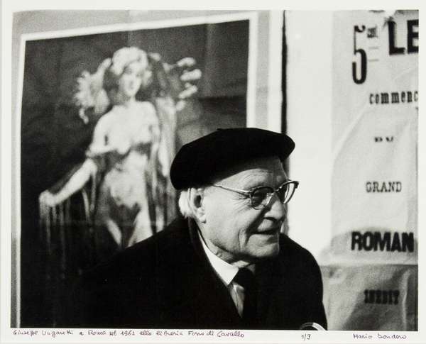 Mario Dondero Giuseppe Ungaretti a Roma nel 1962 alla libreria Ferro di Cavallo, 1962 fotografia,es. 1/3, cm. 40x50 Firma in basso a dx Provenienza dall'artista Bibliografia: Mario Dondero.Ritratti dell'intelligenza (Adriano Parise Editore,Colognola ai Colli (VR),2005,pag. 33)
