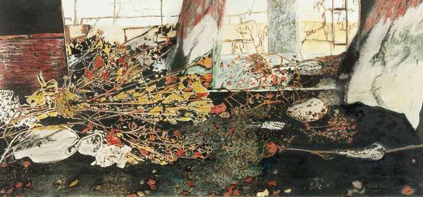 Giuseppe Banchieri Momento nello studio, 1985 tecnica mista su cartoncino riportata su faesite, cm. 32x69 Firma in basso a dx Opera archiviata al n. 905307