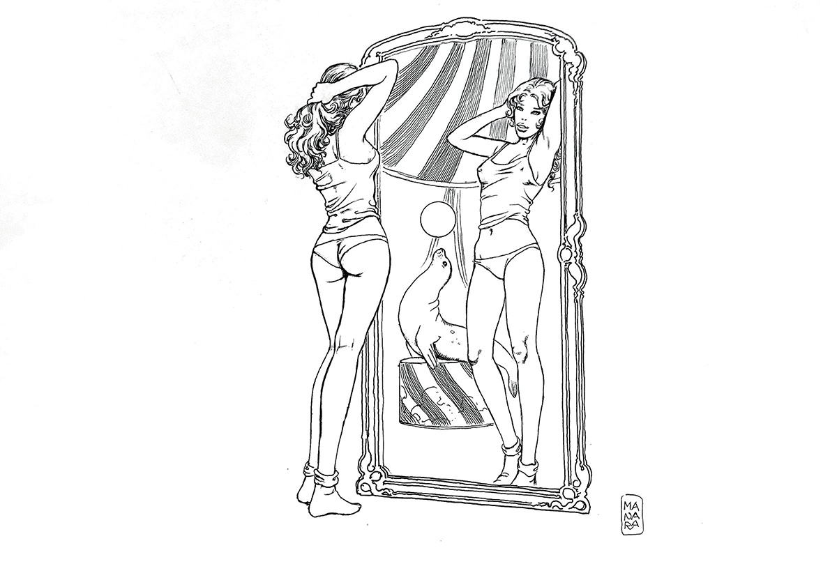 Milo Manara (1945), Calendario Lavazza, Illustrazione pubblicata a pag.24 nel Volume : “ Con te partirò “ pubblicato per conto della Lavazza da edizioni Rizzoli nel 2011 per il ventennale del celebre calendario. L’opera è accompagnata da un testo di Fabio Novembre che così recita : “Poi però si sveglia di colpo in piena notte, accende la luce dell’ abatjour, si alza, lascia scivolare sul tappeto la camicia da notte e resta a lungo, in silenzio, a guardare se stessa dall’altra parte dello specchio, a fissare la Valerie che non è partita, che non ha avuto il coraggio di lasciare la sua cameretta da bambina. E che ancora non ha festeggiato i vent’anni”. Matita e china su cartoncino, cm 33x48. Firmata in cartiglio. Ottimo stato.