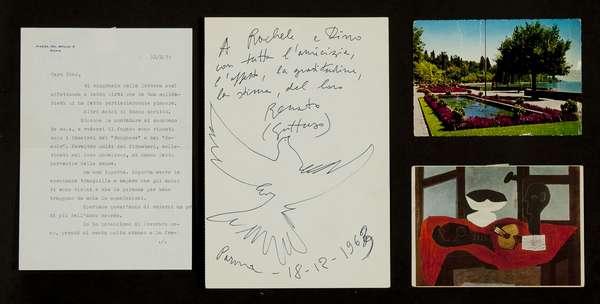 Renato Guttuso Senza titolo lotto unico composto da 2 cartoline, una lettera autografa, un disegno a penna biro, cm. varie misure Firma dell'artista su tutte le opere Dedica ad personam su ogni opera del lotto