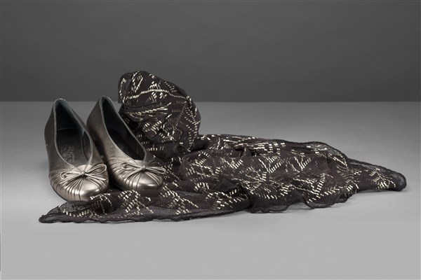 Lotto composto da una sciarpa in tulle marrone ricamata con filo color argento indossata dalla Signora Carla Fracci protagonista nel film del 1969 tratto dal balletto "Giselle" di Adolphe Charles Adam e gentilmente da Lei donata e un paio di ballerine mordoré (tg. 39)