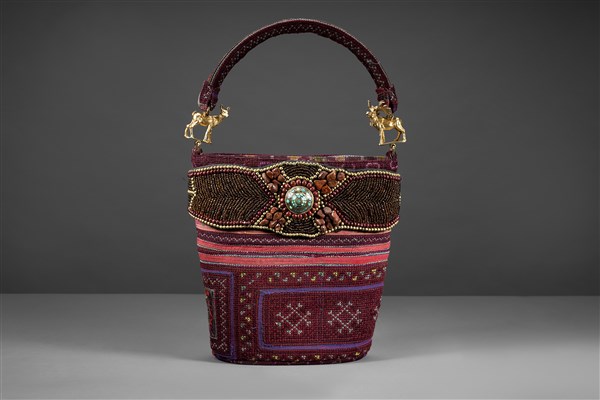 Particolare e originale borsa a secchiello in tessuto kilim, decorata con pietre dure, perline, boules in metallo e legno, il manico sostenuto da due cervi in metallo color oro (cm 23)