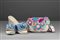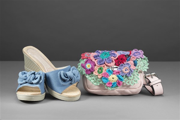 Lotto composto da un marsupio in pelle rosa cipria matelassé con applicazioni di fiori in tricot e un paio di ciabatte con zeppa in tela color jeans (tg. 39) (cm 17)
