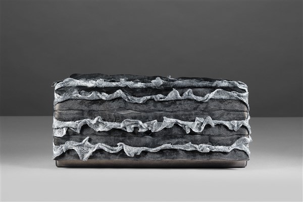 Pochette in pelle grigio argento con motivo di volants in tulle applicati, tracolla asportabile, scatola originale (cm 28)