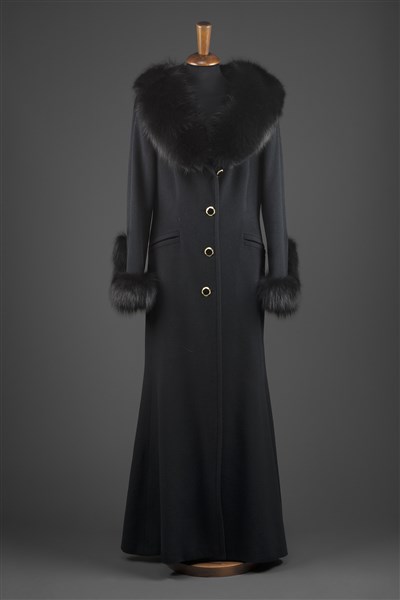 Lungo cappotto nero in lana con collo e polsi bordati in volpe (tg. 44)