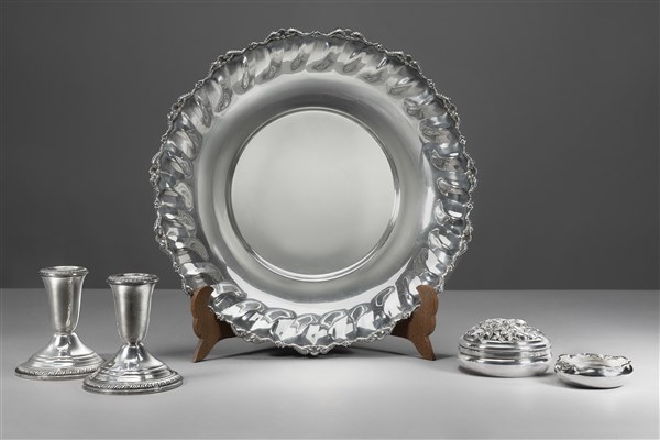 Lotto composto da un centrotavola con bordura decorata a pesci e conchiglie, una scatolina con coperchio decorato a fiori e foglie, un soprammobile con bordo sagomato e una coppia di candelieri con bordure decorate a motivi stilizzati in argento titolo 800 e 925 (g 600 ca.) (cm d. max 31) (lievi difetti)