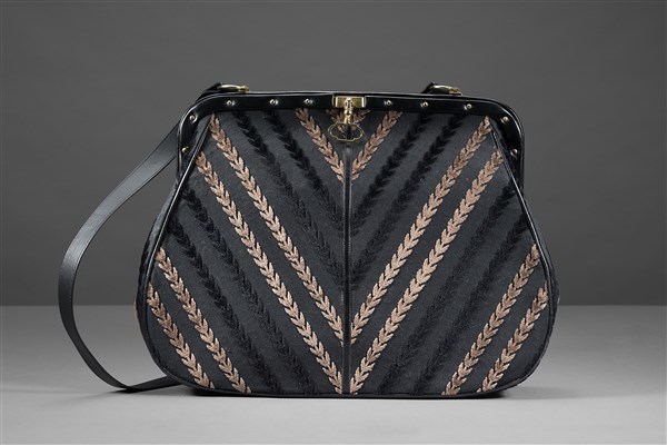 Borsa a tracolla in pelle nera e tessuto, decoro in velluto a spina di pesce nei toni del nero e tabacco (cm 35)