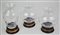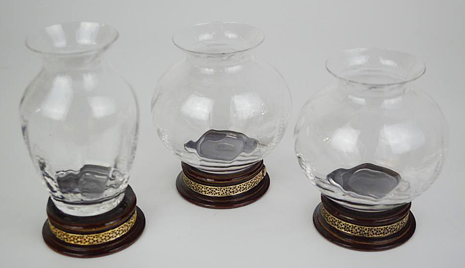 TRE PICCOLI VASI D'ARREDO realizzati in vetro con base lignea cm h 12 circa...