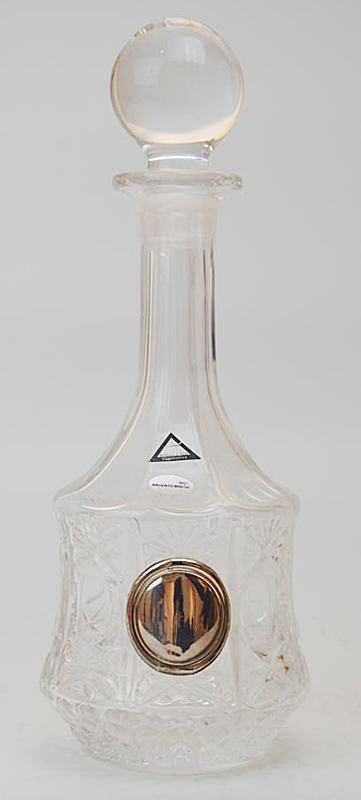 BOTTIGLIA IN VETRO molata e decorata da una piccola placca in argento 800 h...