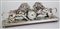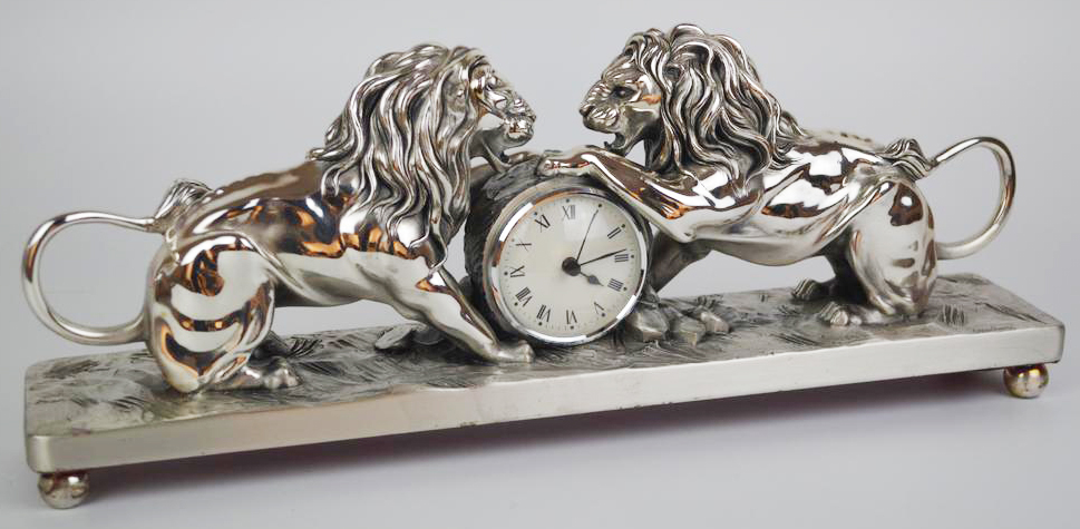 al centro un orologio al quarzo con quadrante circolare in smalto a numerazione romana trattenuto da due leoni ai lati, il tutto laminato in argento e firmato Ottaviani