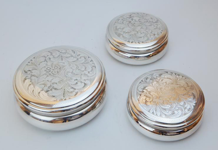 realizzati esternamentente con una lamina in argento cesellato e internamente rivestiti in velluto blu
