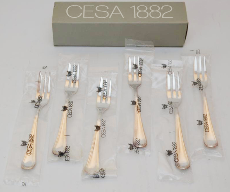 LOTTO DI SEI FORCHETTE DA DOLCE IN METALLO ARGENTATO, CESA 1882