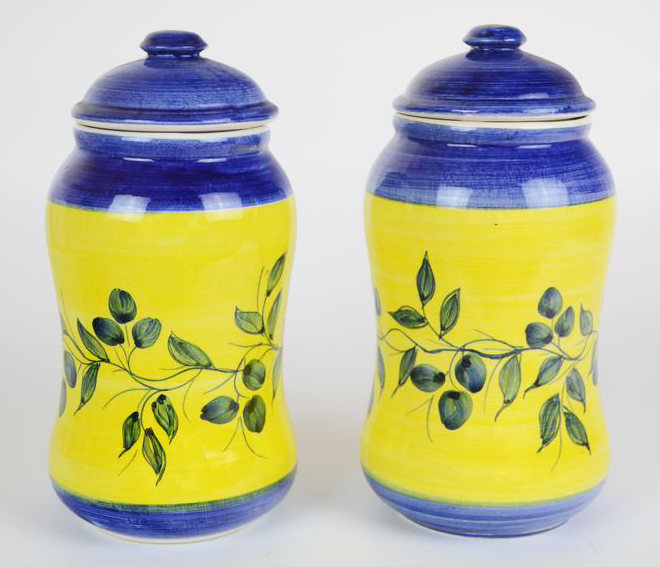 COPPIA DI VASI IN CERAMICA dipinti a mano in colorazioni blu e gialle, al...