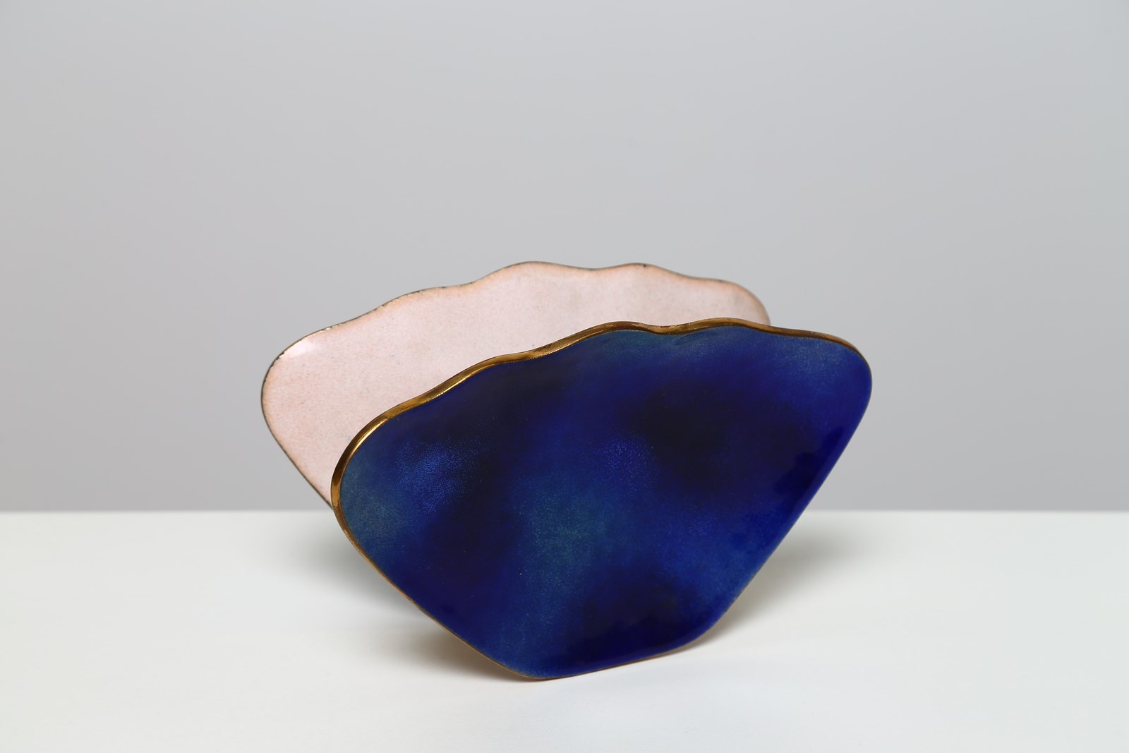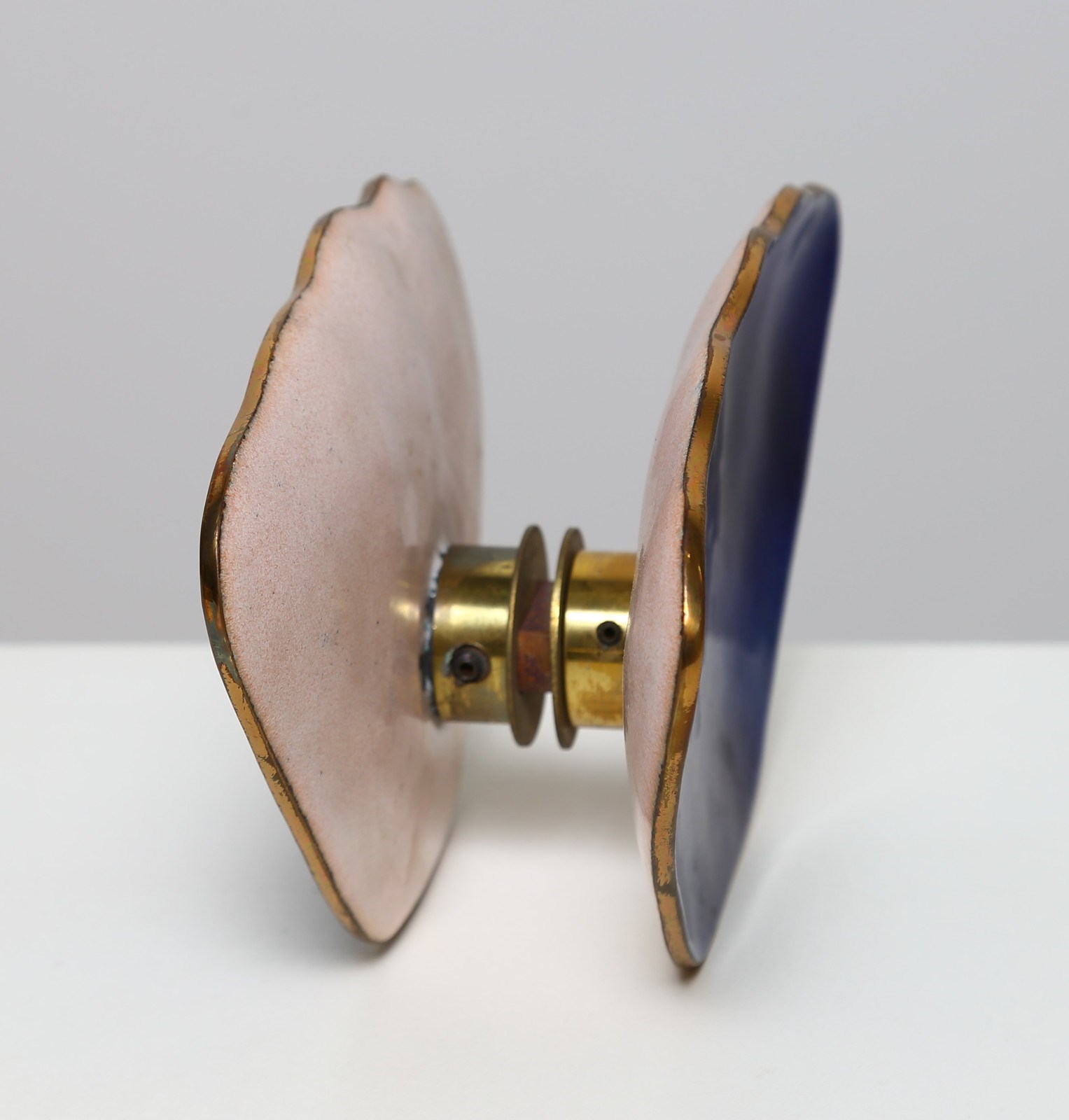 DE POLI PAOLO (1905 - 1996) Maniglia . Rame smaltato. Cm 13,00 x 20,00 x 8,50. Maniglia completa color blu ceruleo, anni 50. L'attività in questo particolare campo del design risale al 1946, quando Paolo De Poli produce maniglie per le ditte V.I.S e Yale & Towne di New York. Una produzione particolarmente nutrita che sfocierà nel 1958 alla mostra alla Wildestein Gallery di New York per la quale, nel catalogo, De Poli affermò" La porta non deve essere soltanto un divisorio..ma avere anche una propria funzione decorativa"
