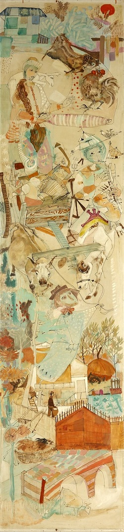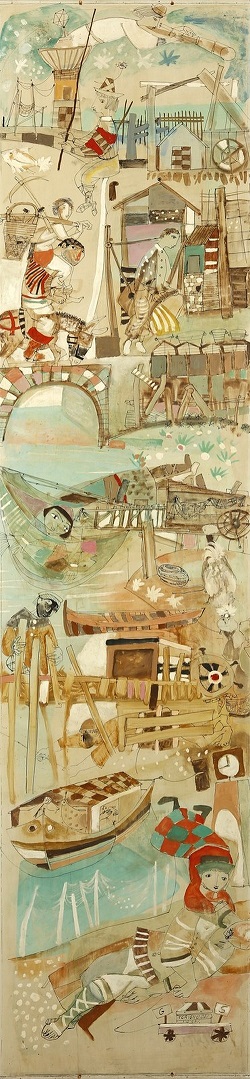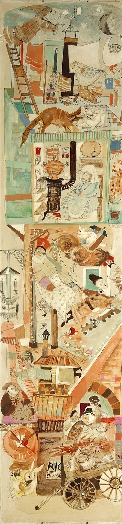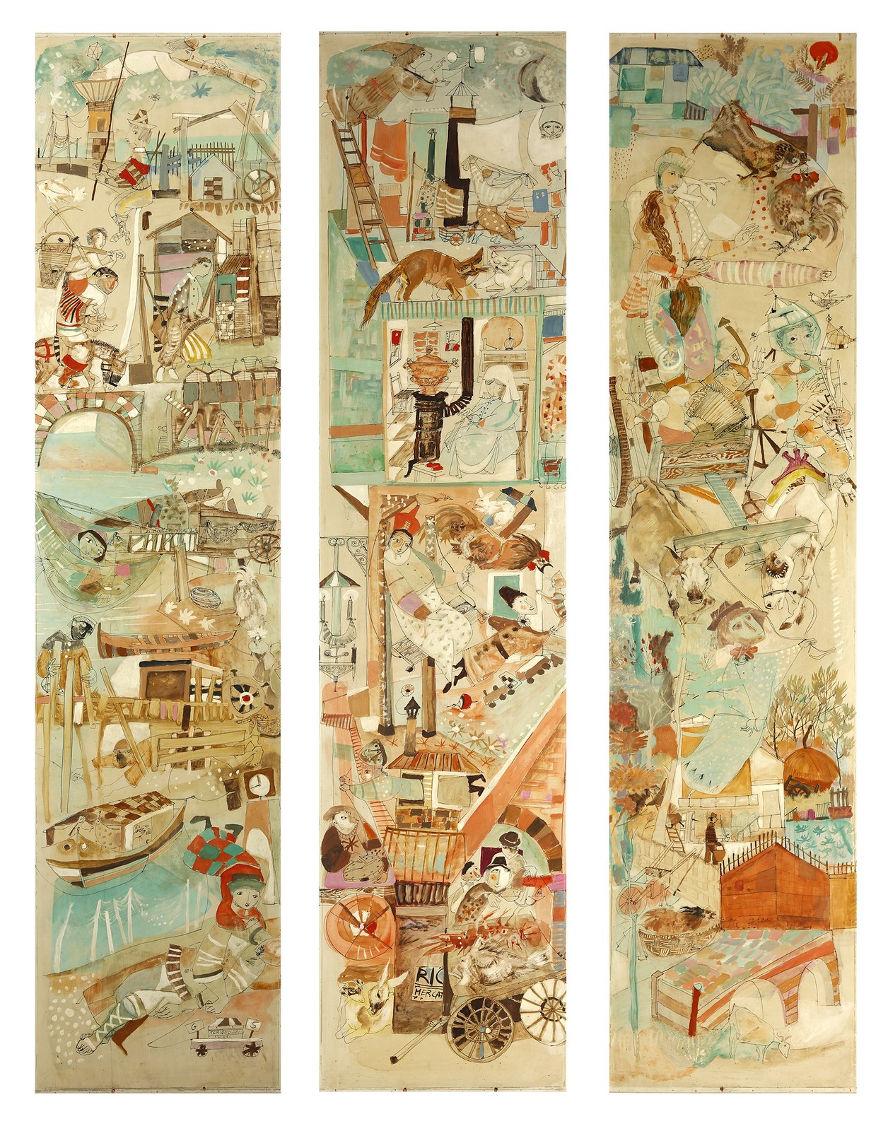 VALENTINI NANNI Scrigno dei sogni (Trittico). Tecnica mista su tavola. Cm 47,00 x 200,00. Trittico a tecnica mista su tavola, realizzato della sua amica personale, dall'architetta e pittrice Luisa Premuda Missiroli a decorazione delle ante di un armadio per la sua casa di Pesaro nel 1958Titolo in basso a destra.
