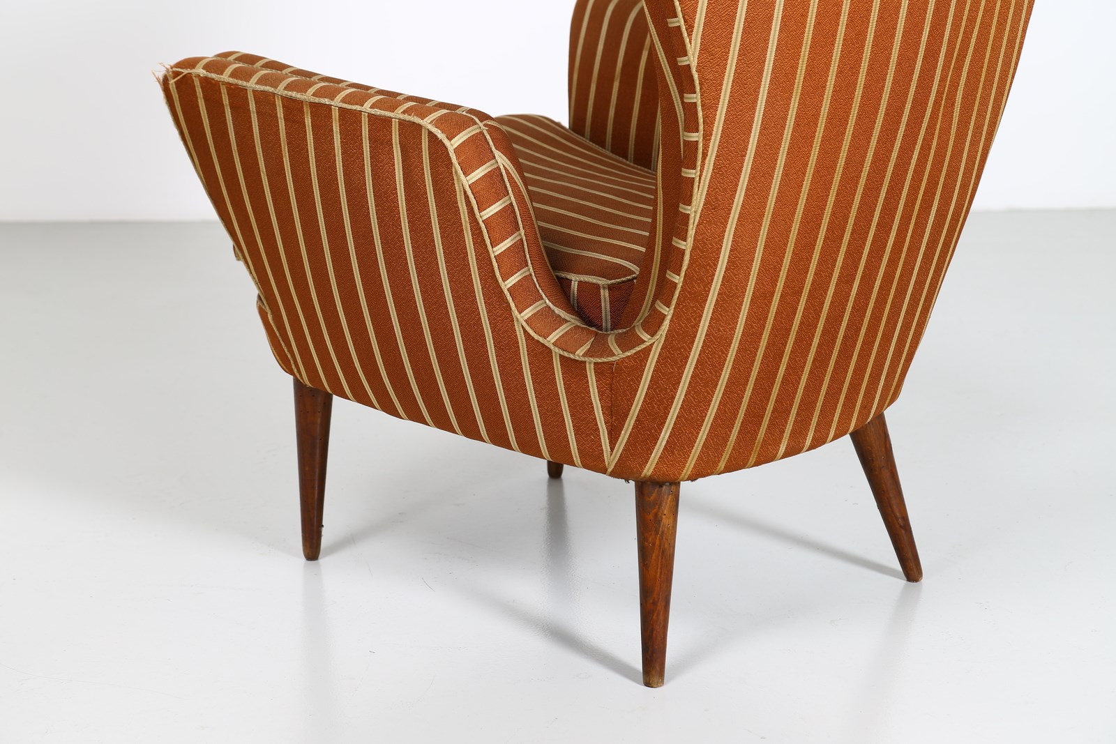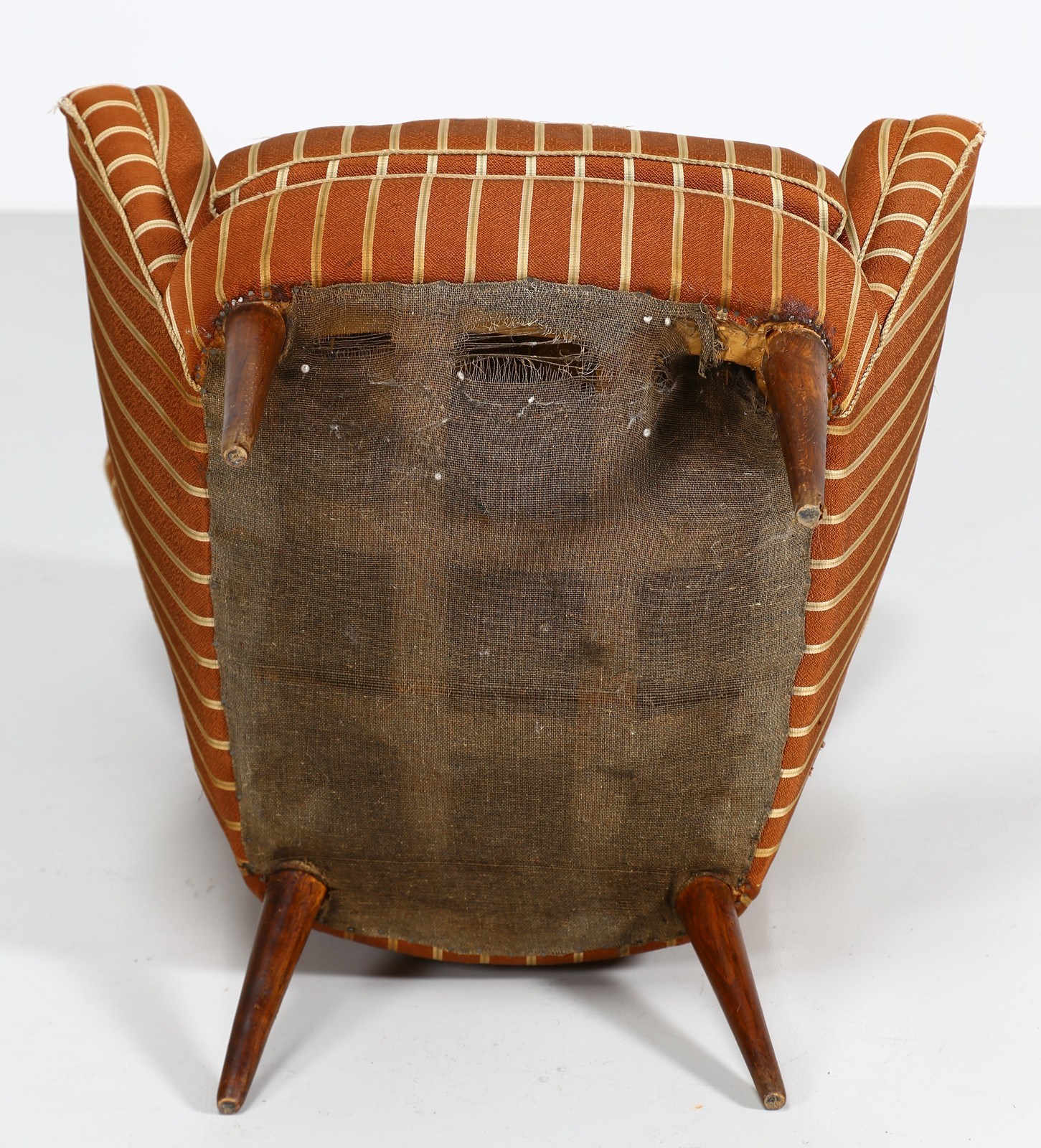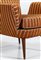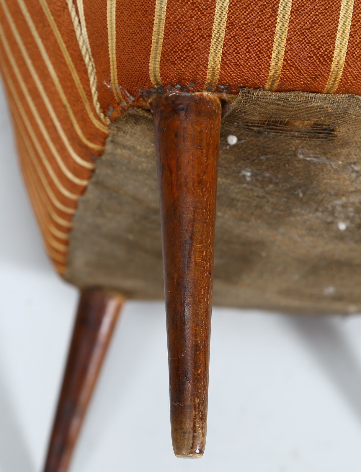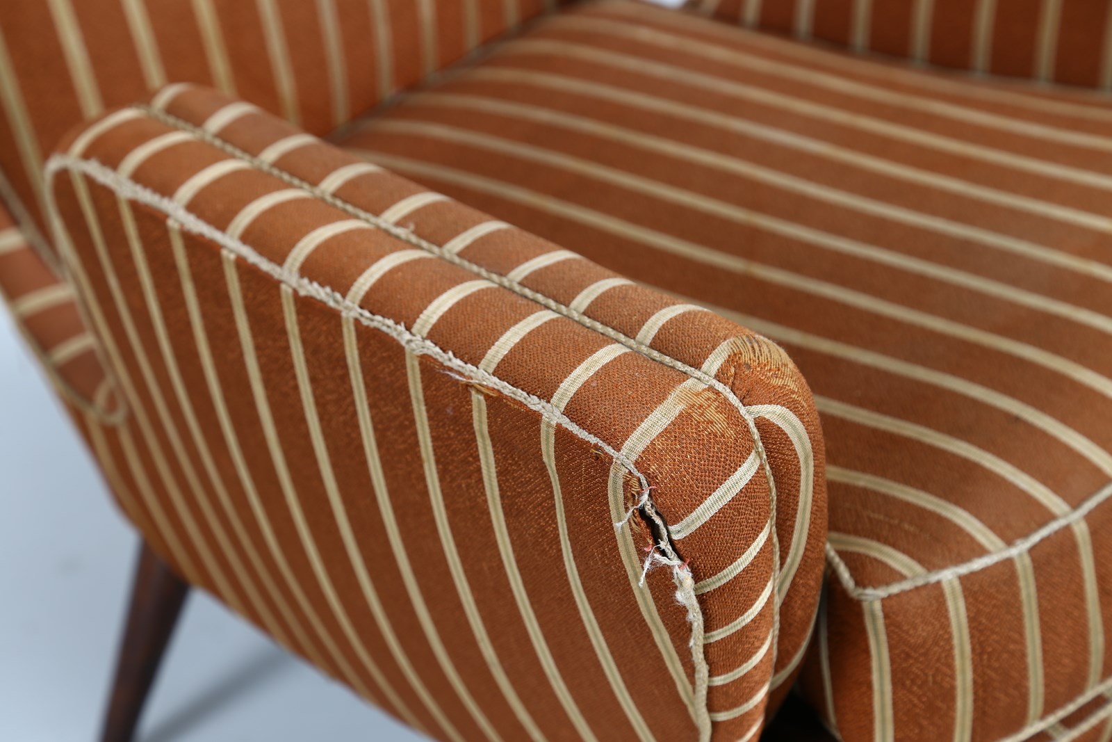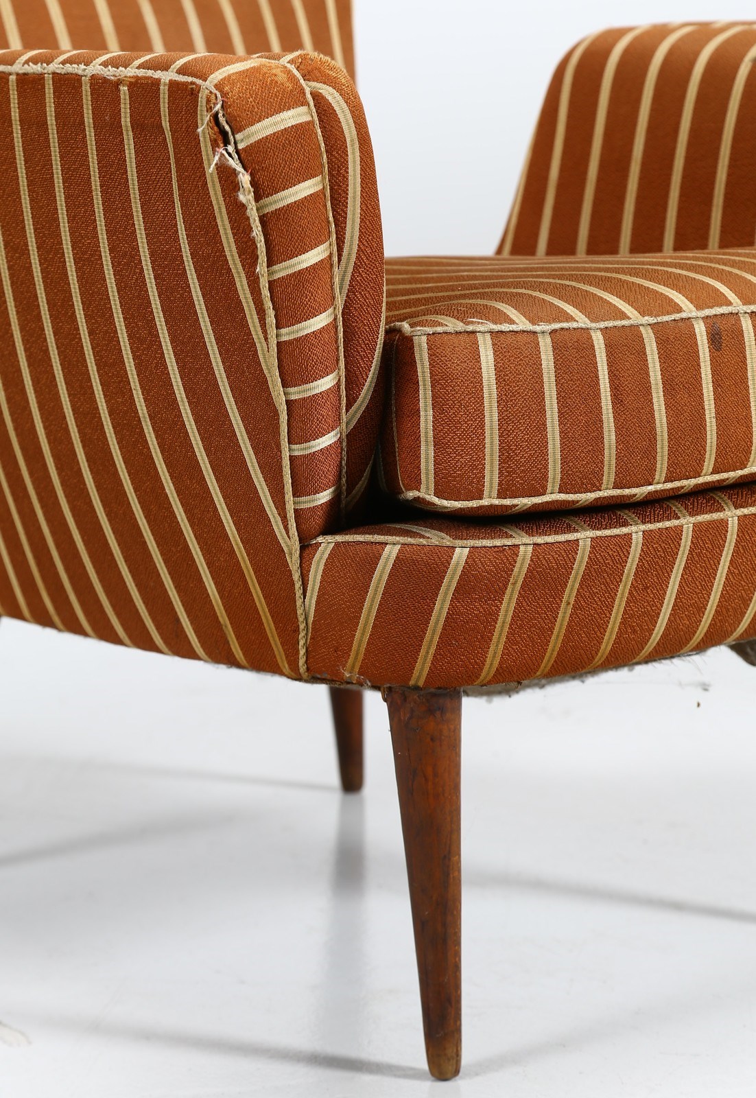 EMILIO SALA E GIORGIO MADINI Coppia di poltrone. Legno e tessuto. Cm 74,00 x 105,00 x 79,00. Coppia di poltrone, produzione F.lli Galimberti, Cantù, anni 50. Struttura in legno, imbottitura e rivestimento in tessuto. Pubblicazioni:"La rivista dell'arredamento", n. 90, 1962, p. 20