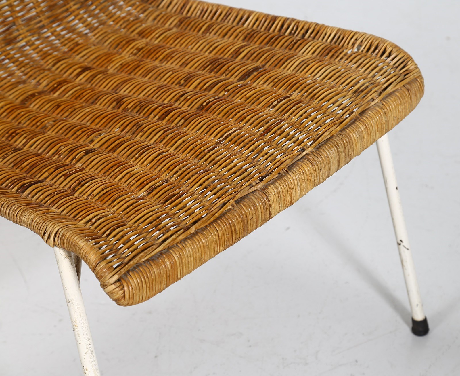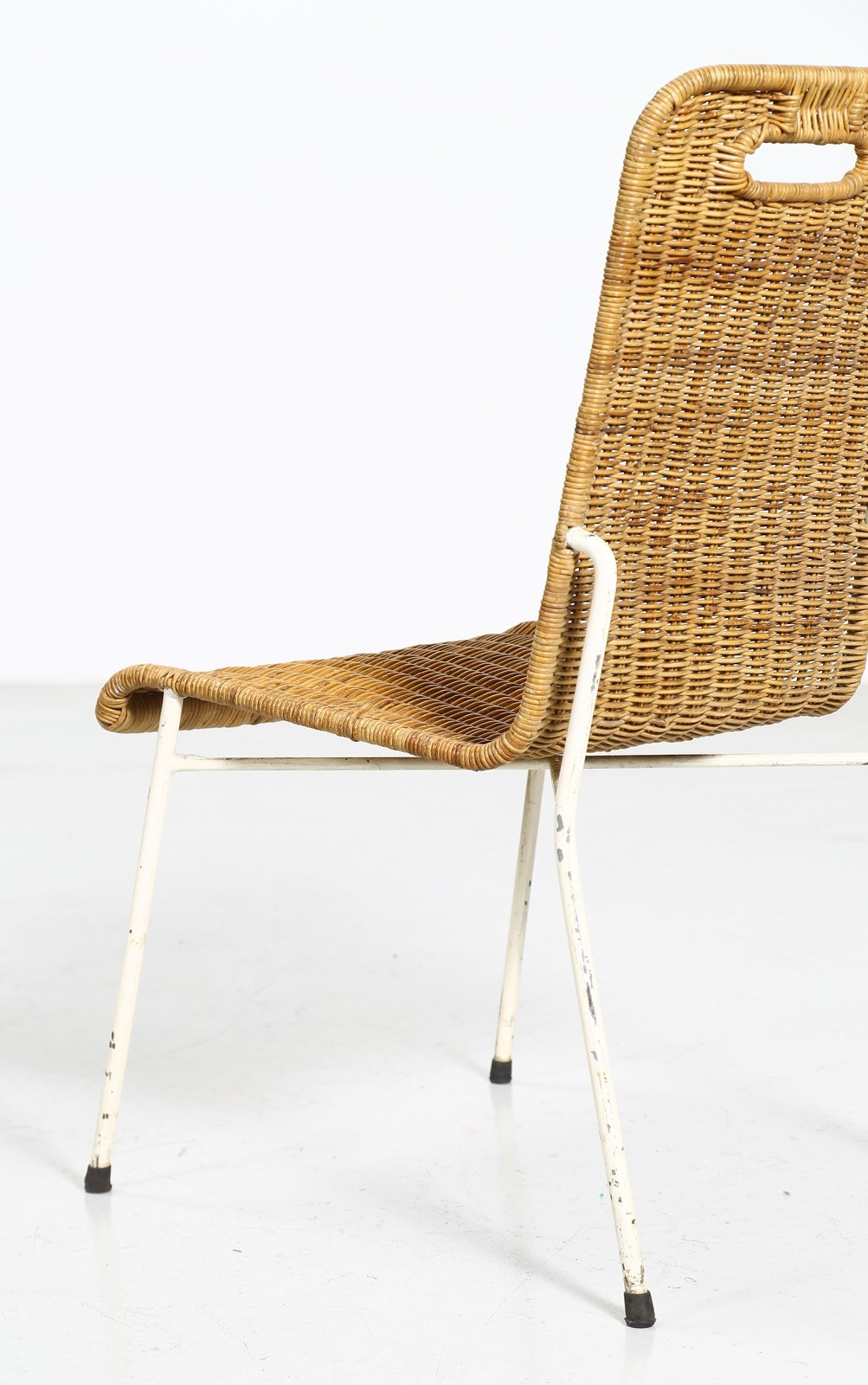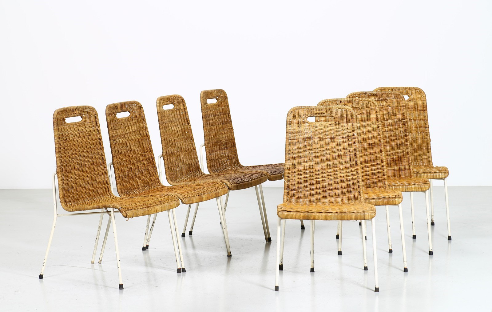 PAGANI CARLO Otto sedie. metallo laccato e vimini. Cm 48,00 x 86,00 x 48,00. Otto sedie in metallo laccato bianco e vimini intrecciato, anni 50. Pubblicazioni: Rivista dell'arredamento, n. 6, giugno 1955, foto di copertina.
