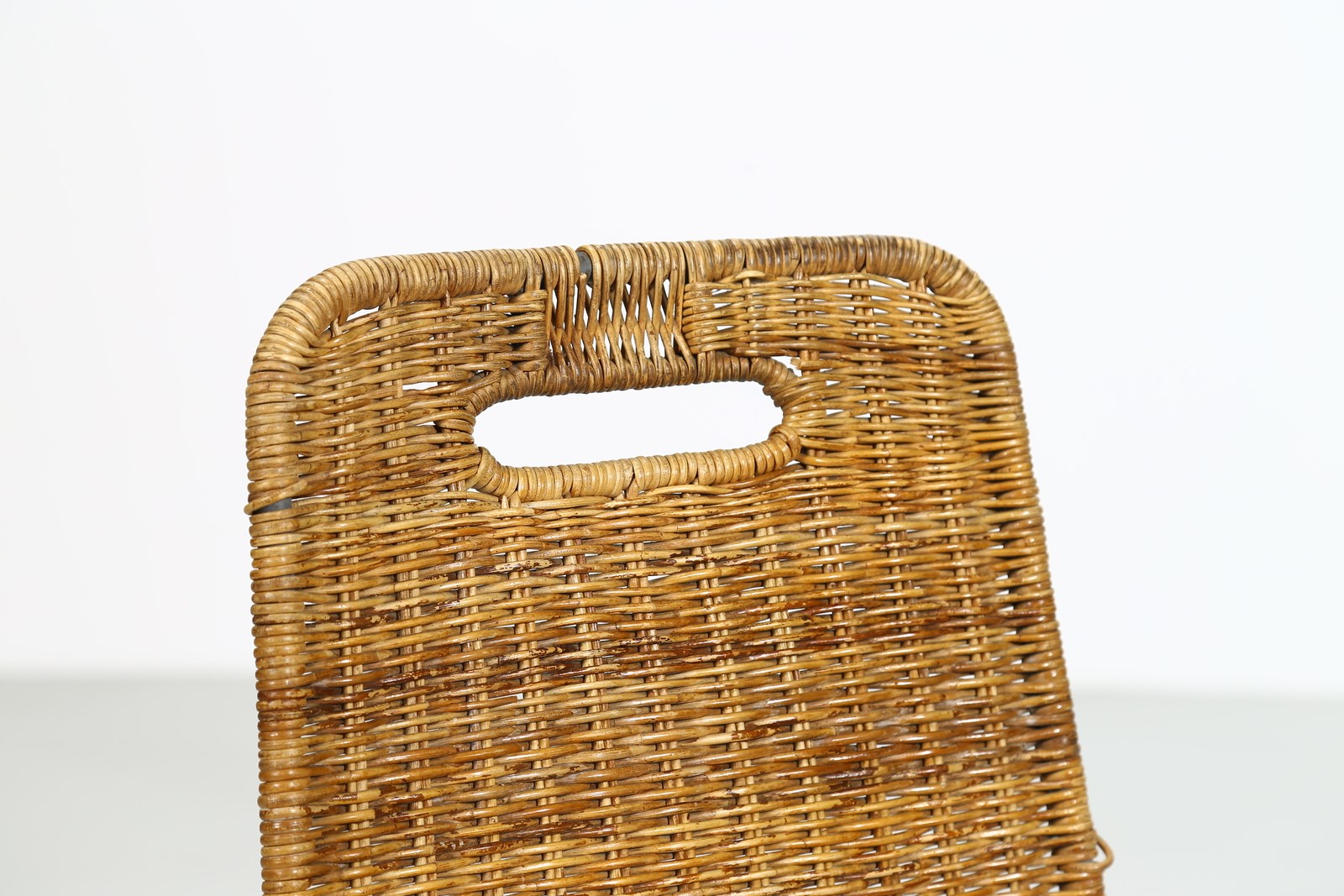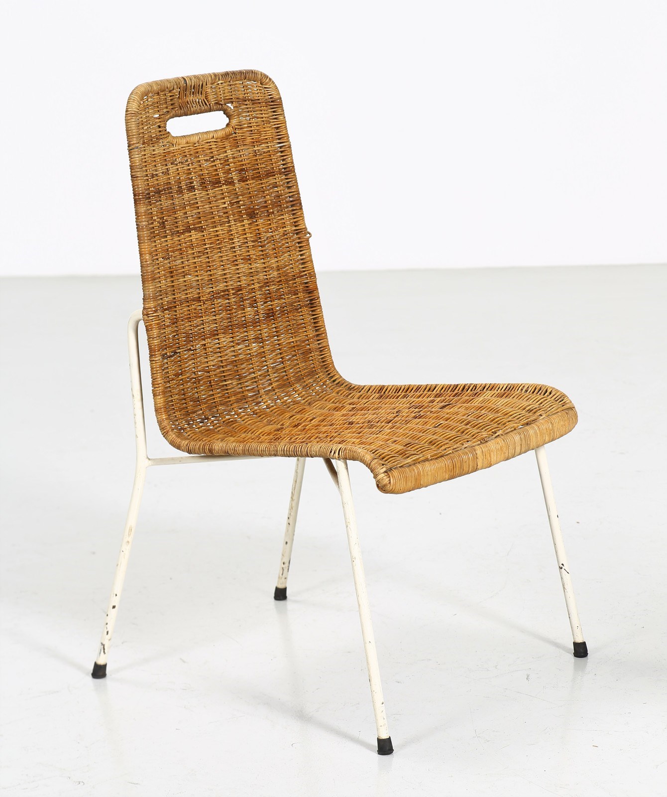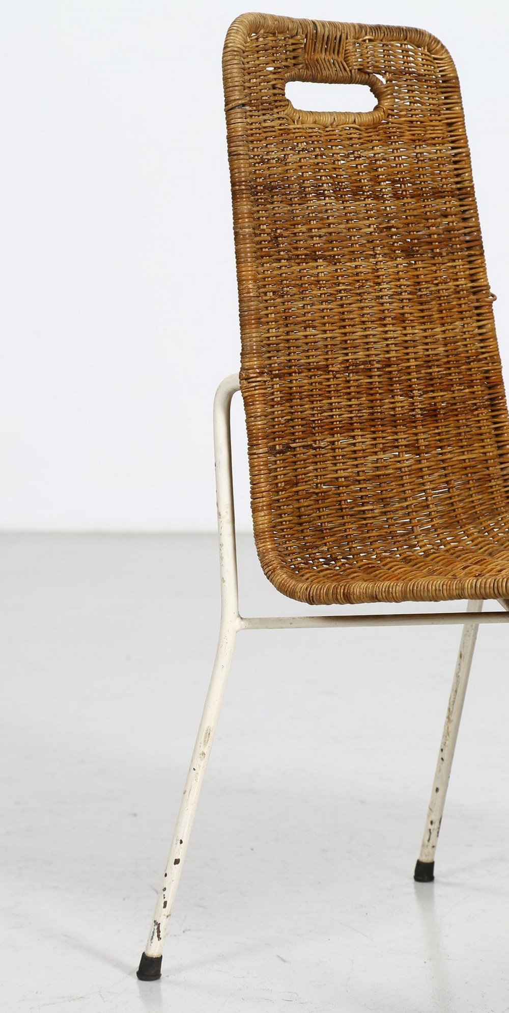 PAGANI CARLO Otto sedie. metallo laccato e vimini. Cm 48,00 x 86,00 x 48,00. Otto sedie in metallo laccato bianco e vimini intrecciato, anni 50. Pubblicazioni: Rivista dell'arredamento, n. 6, giugno 1955, foto di copertina.