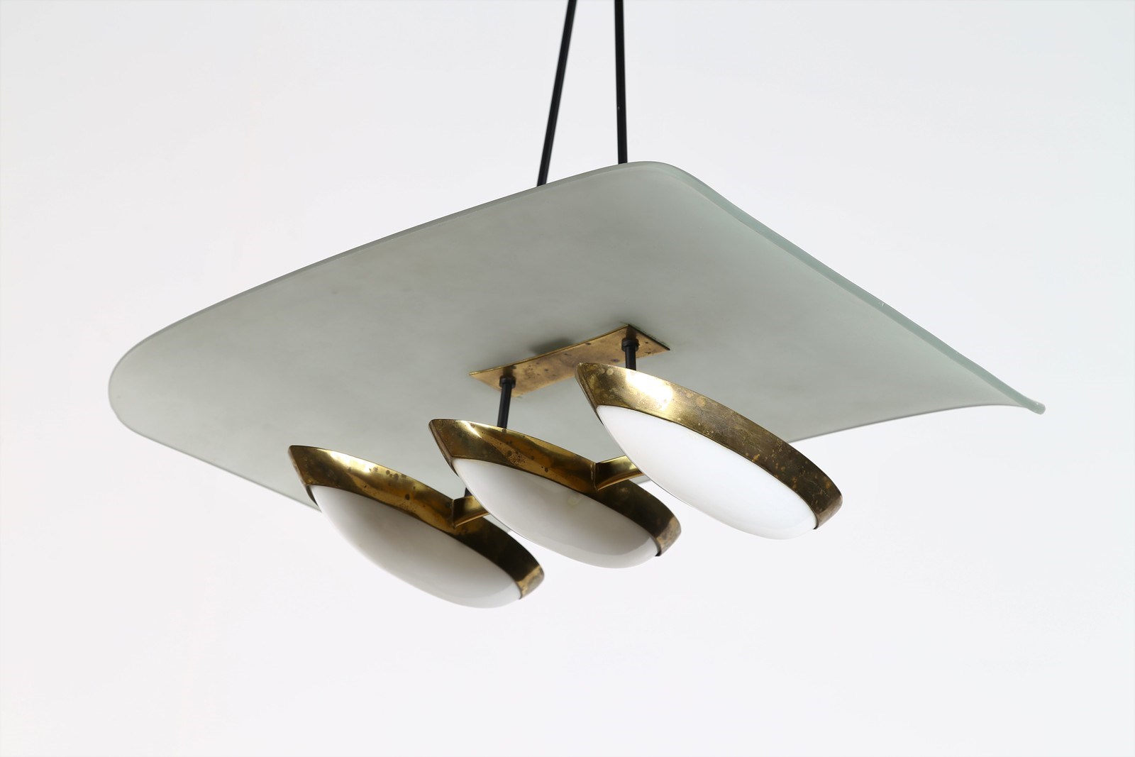 STILNOVO Attrib. Lampadario. Ottone e vetro. Cm 47,00 x 90,00 x 34,00. Lampadario in ottone, metallo laccato e vetro, anni 50.