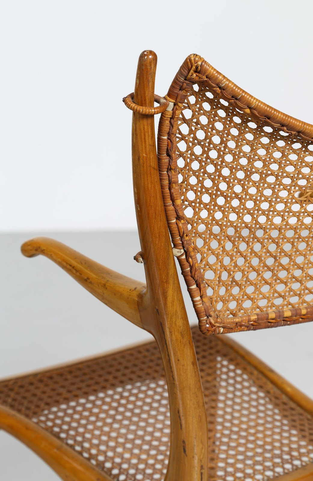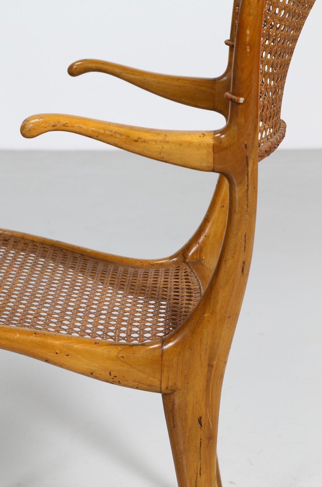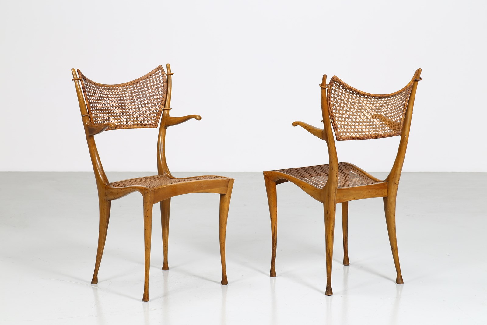 JOHNSON DAN (1918 - 1979) Coppia di poltrone. Legno e paglia di Vienna. Cm 46,00 x 96,00 x 50,00. Coppia di poltrone mod Gazzelle, fine anni 50. Struttura in legno e paglia di Vienna.