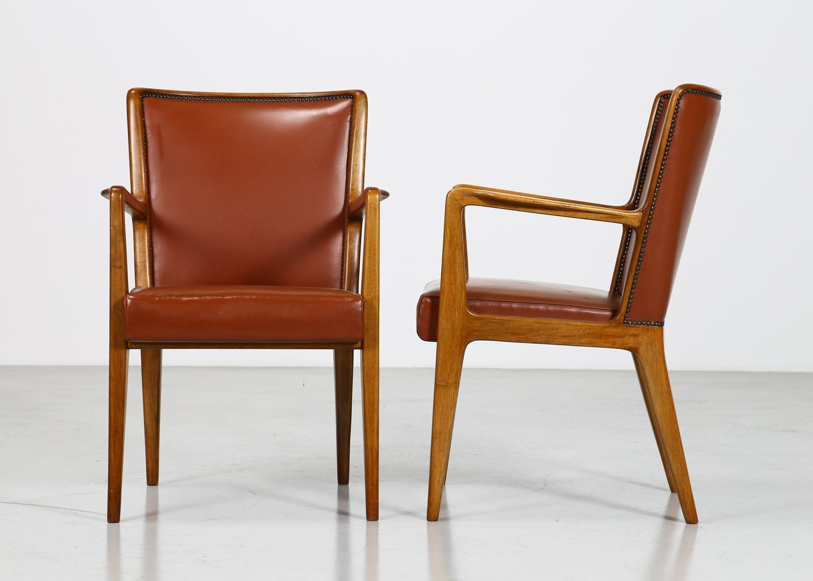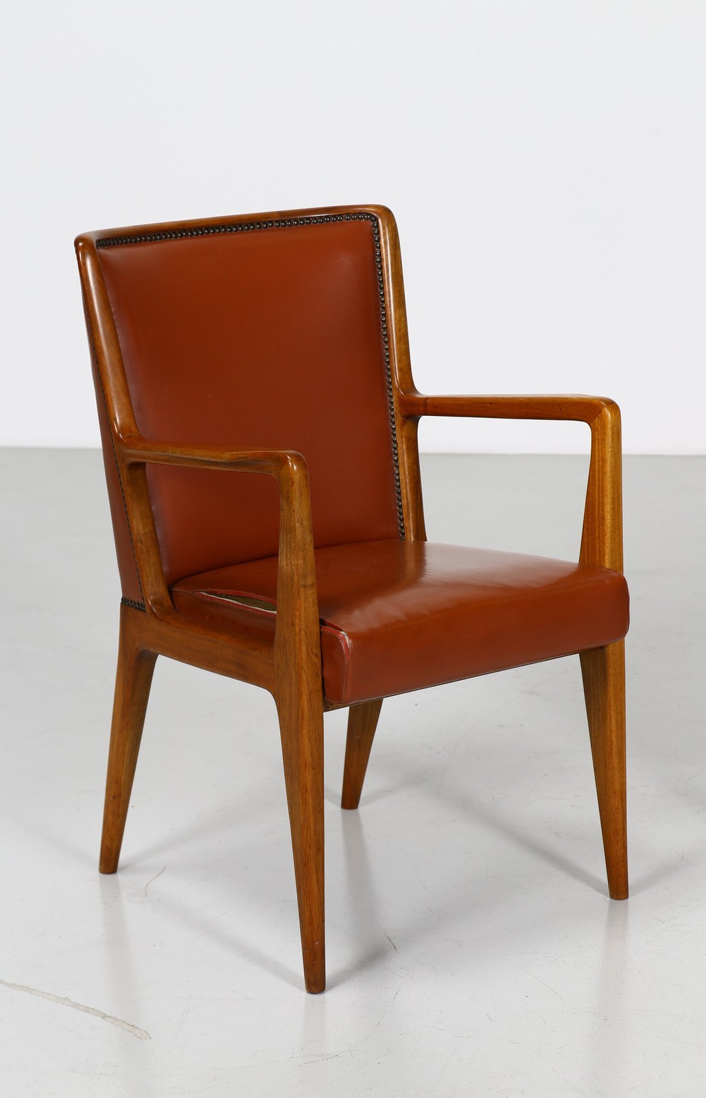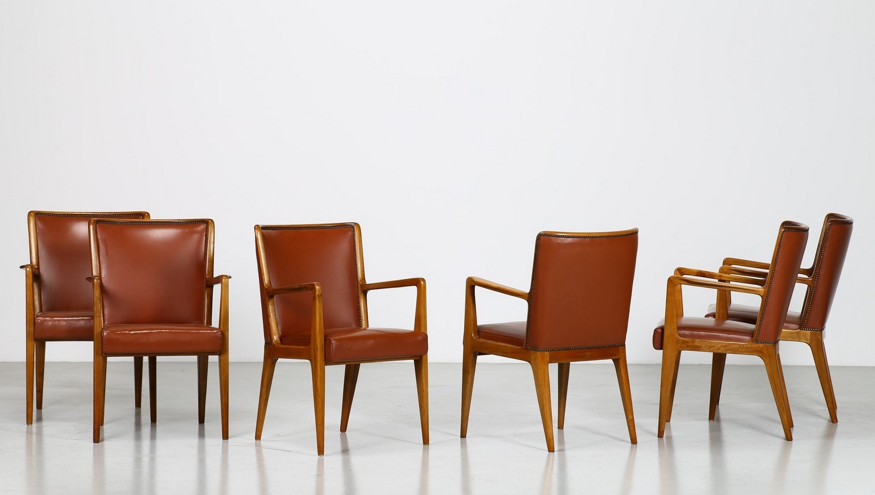PONTI GIO (1891 - 1979) Sei sedie. Legno di noce, pelle e ottone. Cm 58,00 x 87,00 x 60,00. Sei sedie, per Cassina, primi anni 50. Modello n. 498, progettato per la sala giochi di prima classe del transatlantico "Giulio Cesare". Presente etichetta "Figli di Amedeo Cassina 22 38 Meda Milano". Strruttura in legno di noce, pelle e chiodini in ottone. Pubblicazione: Ugo La Pietra, Giò Ponti, Edizioni Rizzoli, 1995, "Poltrone Cassina"- Domus, n.267, febbraio 1952, interni del transatlantico "Giulio Cesare" - Piccione P., Gio Ponti e le navi, il progetto degli interni navali 1948-1953, Idea Books, p. 141