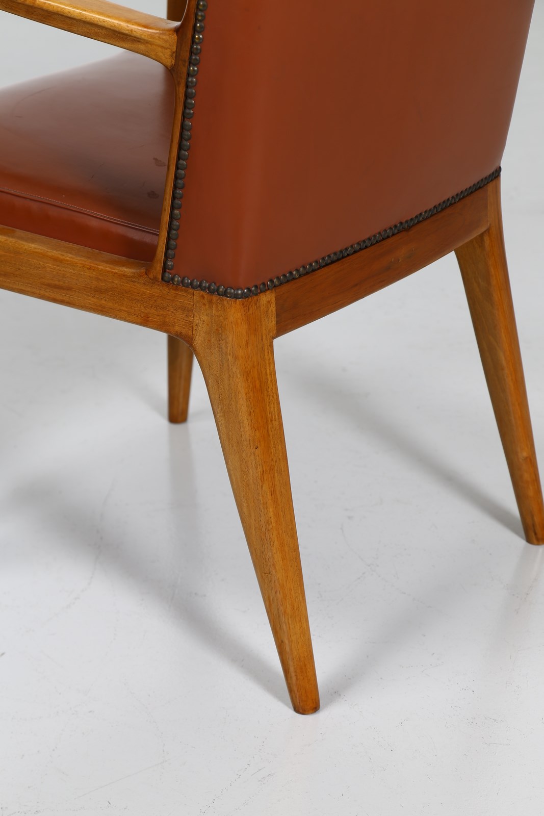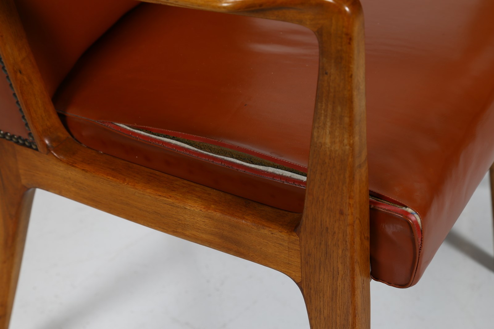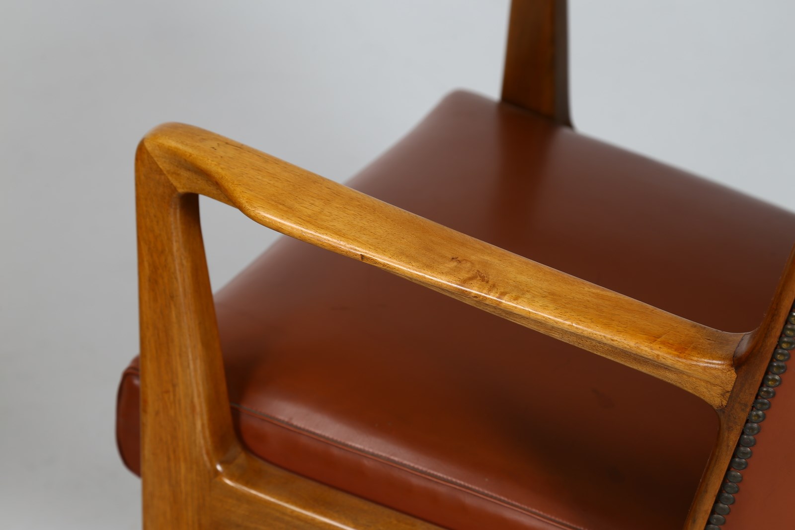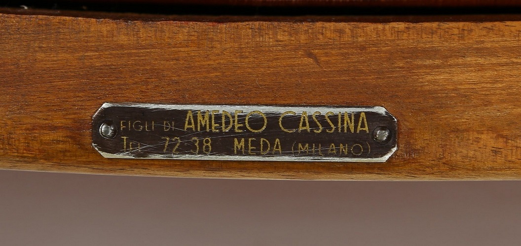 PONTI GIO (1891 - 1979) Sei sedie. Legno di noce, pelle e ottone. Cm 58,00 x 87,00 x 60,00. Sei sedie, per Cassina, primi anni 50. Modello n. 498, progettato per la sala giochi di prima classe del transatlantico "Giulio Cesare". Presente etichetta "Figli di Amedeo Cassina 22 38 Meda Milano". Strruttura in legno di noce, pelle e chiodini in ottone. Pubblicazione: Ugo La Pietra, Giò Ponti, Edizioni Rizzoli, 1995, "Poltrone Cassina"- Domus, n.267, febbraio 1952, interni del transatlantico "Giulio Cesare" - Piccione P., Gio Ponti e le navi, il progetto degli interni navali 1948-1953, Idea Books, p. 141