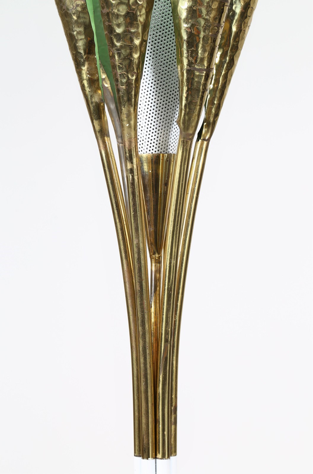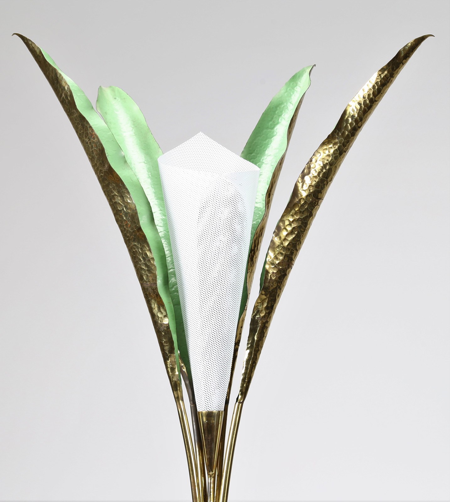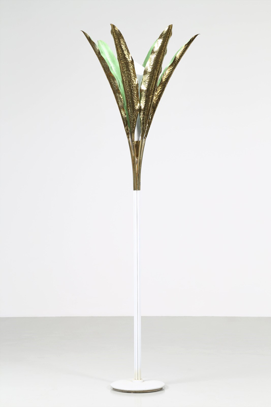 LELII ANGELO (1911 - 1979) Lampada da terra. 1951. Metallo laccato e ottone. Cm 80,00 x 227,00 x 80,00. Modello 12383, per Arredoluce, 1951 circa. Base in ghisa rivestita in alluminio verniciato, struttura in ottone verniciato e lucido, schermi in ottone martellato e verniciato, diffusore in rete metallica. Presenta marchio alla base: Arredoluce - Monza, Italy 12300 Pubblicazioni: Domus, n.293, giugno 1953, p. 20 (Pagina pubblicitaria) - Arredoluce, Catalogo ragionato 1943-1987, a cura di A. Pansera, A. Padoan, A. Palmaghini, Silvana Editoriale, Cinisello Balsamo, 2018, p.283