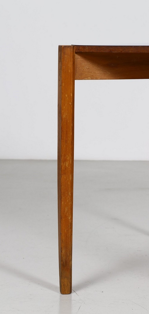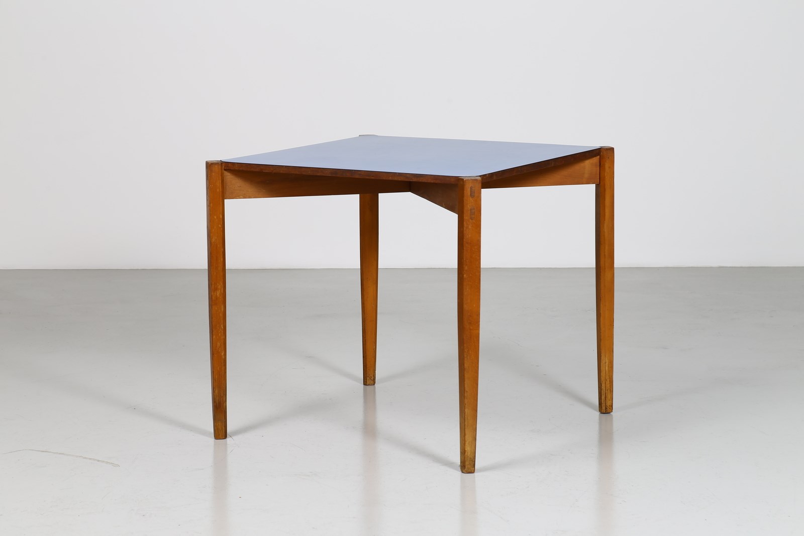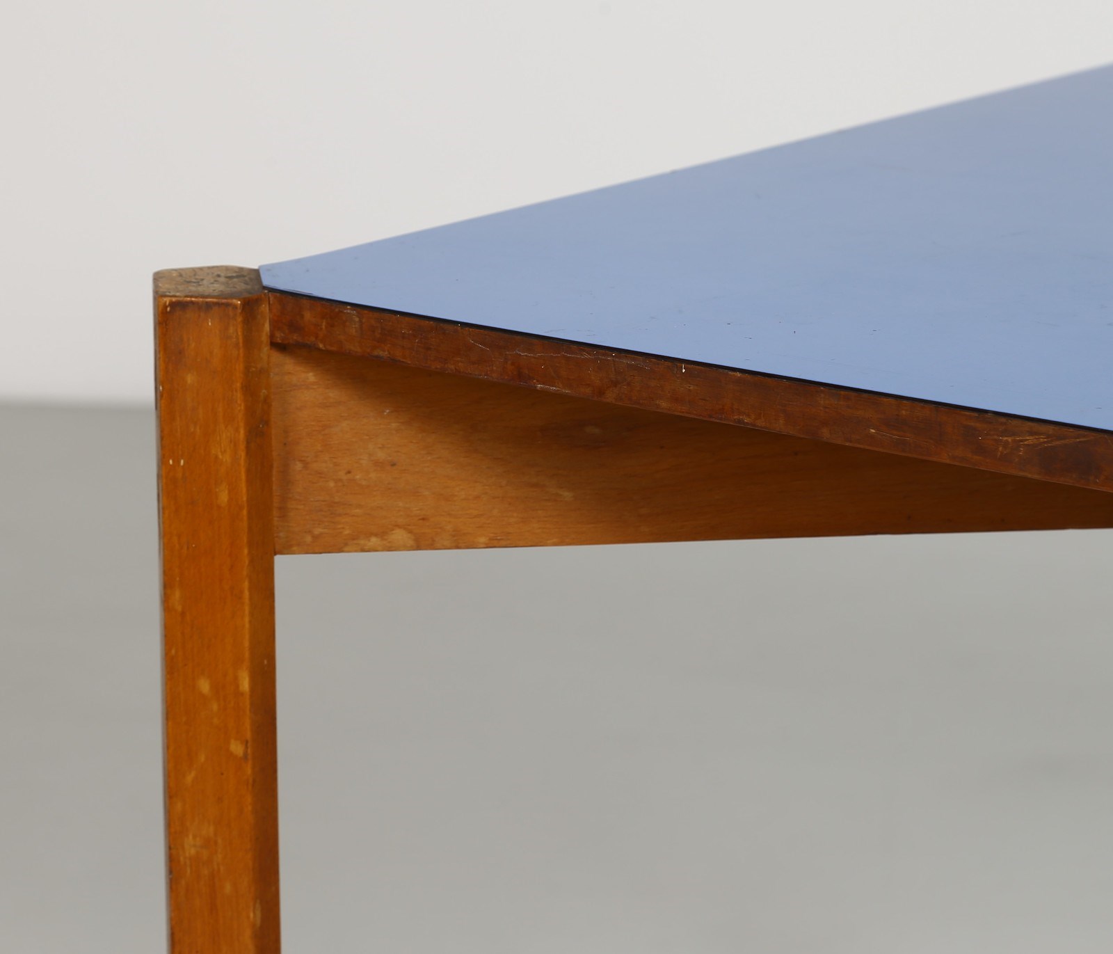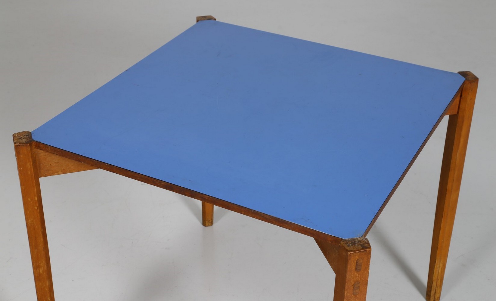 ALCHINI GIULIO (1926 - 1958) Tavolino. Legno di faggio. Cm 85,00 x 77,50 x 85,00. Tavolino in legno di faggio con piano in formica blu, anni 50.Il forte interesse per la fisicità di una forma nello spazio porta Giulio Alchini ad occuparsi di architettura, di design; è sempre di questi anni la vorace conoscenza delle opere dell'architetto, urbanista e pittore Le Corbusier. E' affascinato innanzitutto dell'approccio che il grande architetto ha con le forme e con gli stili. Infatti non gli interessa la coerenze ideologica e meno ancora quella formale: partendo da un modulo elementare vi costruisce sopra un ambiente in cui scultura, scenografia, inconsio e irrazionalità ssi mescolano, si intrecciano continuamente diventando architettura del gesto e della materia. Tratto da: ALCHINI, a cura di Fiorenzo De Gasperi, La Bottega dell'arte, p.9