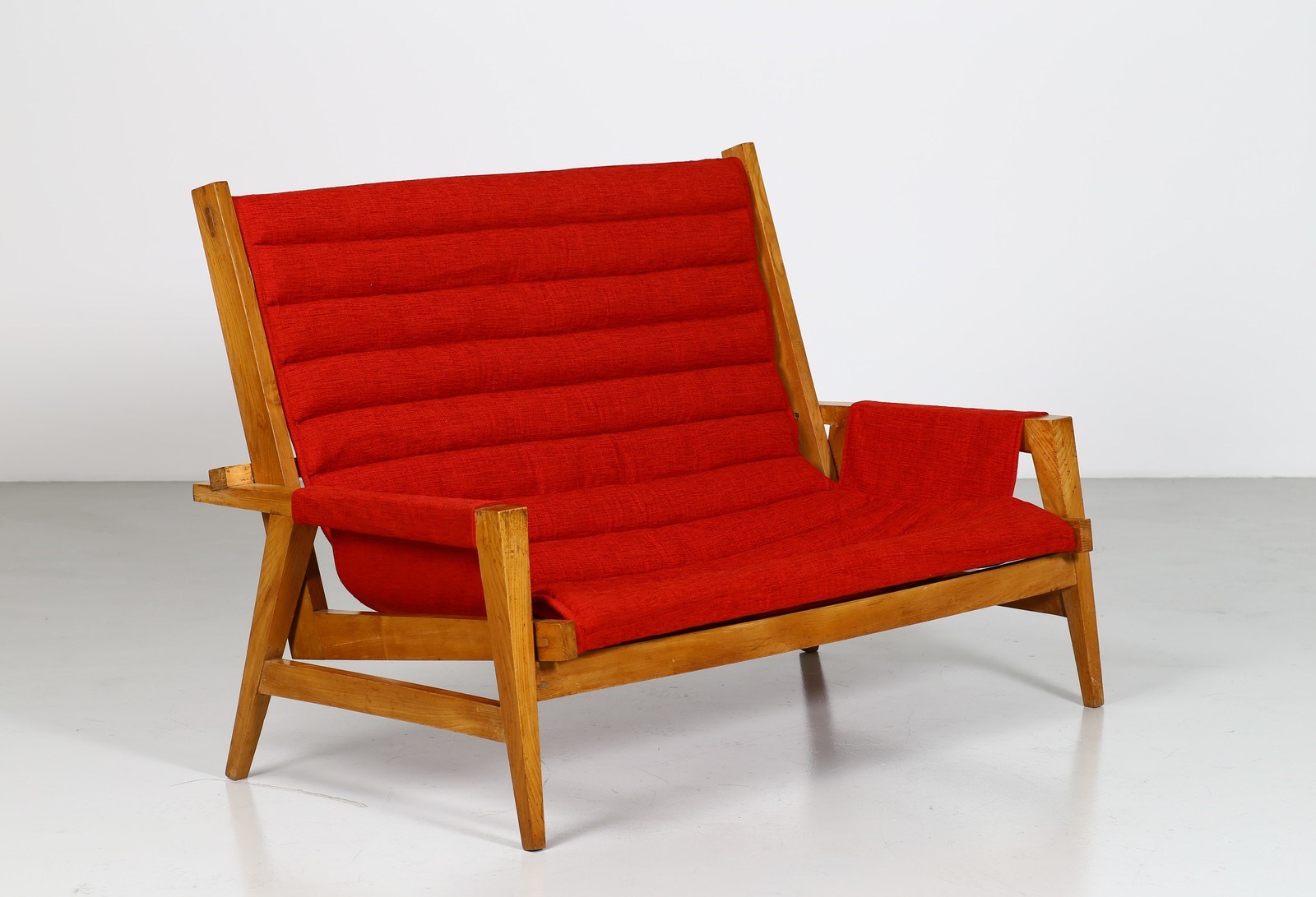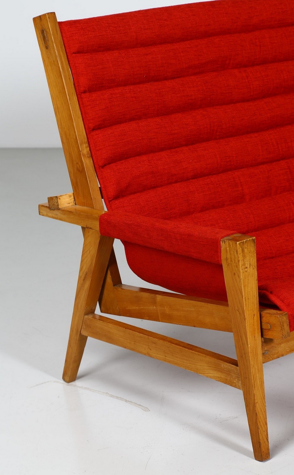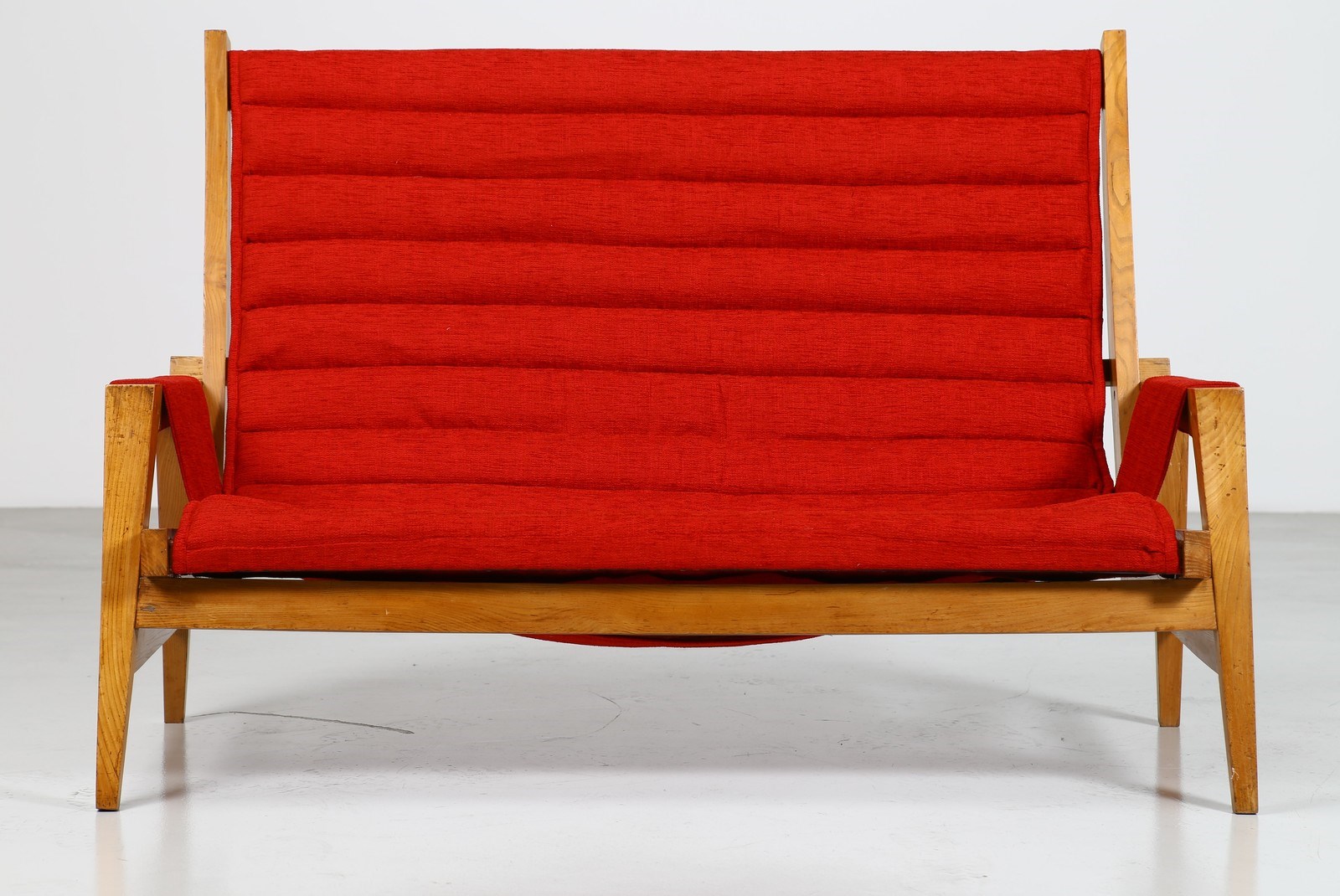 ALCHINI GIULIO (1926 - 1958) Divano. Legno di olmo. Cm 142,00 x 96,00 x 80,00. Divano in legno di olmo e tessuto, anni 50. Il forte interesse per la fisicità di una forma nello spazio porta Giulio Alchini ad occuparsi di architettura, di design; è sempre di questi anni la vorace conoscenza delle opere dell'architetto, urbanista e pittore Le Corbusier. E' affascinato innanzitutto dell'approccio che il grande architetto ha con le forme e con gli stili. Infatti non gli interessa la coerenze ideologica e meno ancora quella formale: partendo da un modulo elementare vi costruisce sopra un ambiente in cui scultura, scenografia, inconsio e irrazionalità ssi mescolano, si intrecciano continuamente diventando architettura del gesto e della materia. Tratto da: ALCHINI, a cura di Fiorenzo De Gasperi, La Bottega dell'arte, p.9